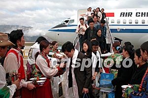 28日上午8點(diǎn)40分,104名來(lái)自全國(guó)各地的游客搭乘國(guó)航西南公司5027號(hào)波音737—600客機(jī)經(jīng)過(guò)45分鐘的飛行順利抵達(dá)九寨黃龍機(jī)場(chǎng),宣告九寨航線正式通航。圖為當(dāng)?shù)夭刈迕癖姭I(xiàn)上青稞酒和哈達(dá),迎接來(lái)自各地的首航游客。作者:易世忠
