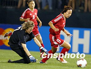 已在世界杯上打進十一球的孫雯在第二十九分鐘時險些平了美國人保持的世界杯個人進球紀錄,她在對方禁區(qū)內(nèi)頭球沖頂,球打在立柱上彈出。