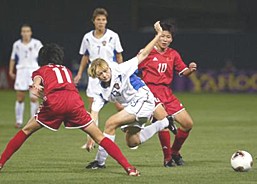 因為同組的加納隊在先進行的另外一場比賽中出人意料地以二比一戰(zhàn)勝善擺“鐵桶陣”的澳大利亞隊,把中國隊提前送進八強,這無疑給中國隊員減輕了很大的心理壓力。必須取勝才能以小組第一的身份出線的中國隊一開場就對俄隊的陣地展開了猛攻,而俄隊并沒有像人們賽前預料的那樣收縮密集防守,而是與中國隊展開對攻。中國隊兇狠的中場搶截使俄隊難以組織起像樣的進攻,而有了中場有力支持,中國隊鋒線上的兩把尖刀孫雯和白潔開始顯現(xiàn)應有的威力,俄隊門前險情不斷。
