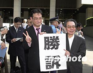 法庭內(nèi),判決結(jié)果只宣布到一半,日本律師團的幾位年輕辯護律師就已經(jīng)抑制不住激動地舉起拳頭,有的還興奮地和在場中國原告握起手。不懂日語的原告李臣在弄明白判決結(jié)果后,頓時百感交集,淚水橫流。小姑娘劉敏懷抱著父親的遺像早已泣不成聲。而此時旁聽席上也響起了掌聲和叫好聲,使判決書的宣讀中斷了數(shù)秒。