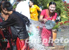 北京中華民族園十月國慶節(jié)期間各民族景區(qū)分別舉行傳統(tǒng)節(jié)日文化遺產(chǎn)展示活動,在傣族潑水節(jié)場地,各民族民眾以潑水形式祝福朋友的幸福和快樂。中新社記者:鄒憲