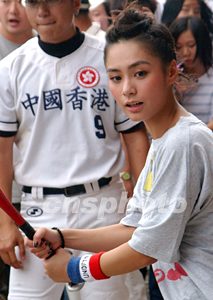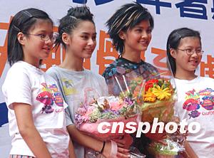 香港樂壇人氣組合TWINS,十月四日出席在香港理工大學舉辦的青少年體育嘉年華活動,兩名理大學生向TWINS獻花。中新社記者:錢興強
