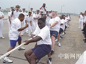 23日,中美海軍首先進(jìn)行了拔河友誼比賽。拔河比賽應(yīng)該說(shuō)是中國(guó)海軍水兵的強(qiáng)項(xiàng),在97年南海艦隊(duì)對(duì)美洲四國(guó)五港的訪問(wèn)中,中國(guó)海軍水兵拔河隊(duì)一路上攻城拔寨、未嘗敗績(jī)。但這次美國(guó)水兵拔河隊(duì)是有備而來(lái),且來(lái)者不善。15名隊(duì)員個(gè)個(gè)膀大腰圓、粗壯結(jié)實(shí),比如,其中一名黑人隊(duì)員桑塔納(SANTANA),此人身高199CM,體重250斤,來(lái)自美國(guó)亞特蘭大,是艦上的武器部門(mén)人員。中方隊(duì)員與對(duì)手相比在塊頭上明顯吃了虧,處于劣勢(shì)。比賽開(kāi)始前,美方隊(duì)員圍在一起,大聲鼓勁。比賽開(kāi)始后,中方水兵拔河隊(duì)奮力與對(duì)手展開(kāi)拉鋸戰(zhàn),雖拼盡全力,無(wú)奈實(shí)力稍遜一籌,最后不無(wú)遺憾地輸?shù)舯荣,美?guó)水兵也算報(bào)了上次比賽的一箭之仇。