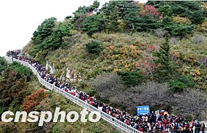 “十一”長(zhǎng)假期間,山東泰山風(fēng)景區(qū)游客如云。圖為泰山頂上等候空中纜車的數(shù)百米長(zhǎng)龍。中新社記者:王麗南