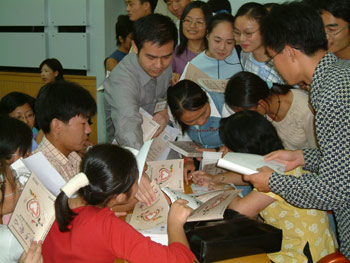 華夏愛心團(tuán)愛心專員、著名畫家李繁民向合工大的愛心志愿者組織贈(zèng)送了現(xiàn)場(chǎng)即做的巨畫“鵬程萬(wàn)里”圖。演講結(jié)束后,太陽(yáng)星城愛心之旅采訪團(tuán)向合工大贈(zèng)送了來自民間的思悟錄——〈牽手愛心〉,大學(xué)生們將周永琴、趙玉芝、宋體金、李繁民團(tuán)團(tuán)圍住,請(qǐng)他們簽字留念。