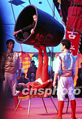 “十一”長假期間中國雜技之鄉(xiāng)吳橋迎來一年中旅游黃金時(shí)節(jié)。在匯聚各路雜技高手的“雜技大世界”內(nèi),一位纖弱女子足蹬二百公斤的重物旋轉(zhuǎn)表演,令觀眾驚嘆不已。據(jù)悉,當(dāng)?shù)厝种回?cái)富來自雜技旅游收入。中新社記者:王麗南