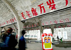 照片和裝置藝術(shù),配上陳舊的機(jī)床與剝落的標(biāo)語,由五十年代舊廠房改建的“798藝術(shù)新區(qū)”成為北京黃金周的新旅游熱點(diǎn)。中新社記者:鄭萍萍