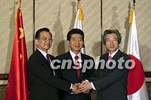 中國國務院總理溫家寶、日本首相小泉純一郎以及韓國總統(tǒng)盧武鉉十月七日在巴厘島舉行了中日韓領導人第五次會晤。會晤結束后,三國領導人簽署了《中日韓推進三邊合作聯(lián)合宣言》。中新社記者:齊彬