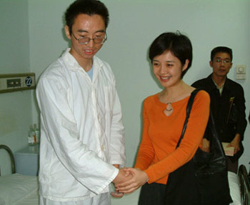 9月26日下午,帶病堅(jiān)持工作的鳳凰衛(wèi)視知名女主播、“華夏愛(ài)心團(tuán)愛(ài)心專員”許戈輝,手捧鮮花,來(lái)到空總血液科病房慰問(wèn)干海濤,并現(xiàn)場(chǎng)捐贈(zèng)了一萬(wàn)元,表達(dá)自己的愛(ài)心,祝愿海濤早日康復(fù)。北京太陽(yáng)宮房地產(chǎn)有限公司總經(jīng)理韓國(guó)建也代表華夏愛(ài)心團(tuán)捐助了現(xiàn)款,并邀請(qǐng)海濤在“牽手愛(ài)心墻”的采集印上按下了自己的手印。