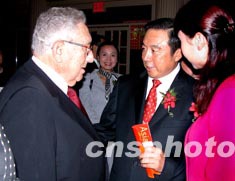 美東時(shí)間十月九日晚,美國(guó)前國(guó)務(wù)卿基辛格(左)來(lái)到紐約華爾道夫酒店,祝賀中國(guó)最大的上市銀行——招商銀行在美國(guó)設(shè)立代表處。中新社記者:陳建