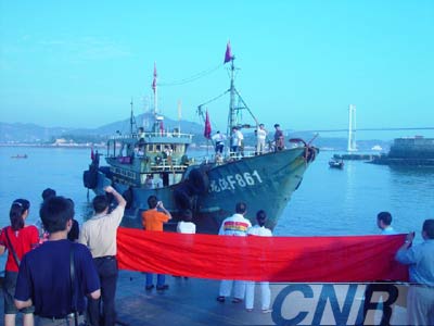 中新網(wǎng)10月11日電 據(jù)中廣網(wǎng)報(bào)道,10月11日早晨7點(diǎn),搭載兩岸三地首次攜手保釣行動(dòng)10名勇士的“閩龍漁F861”號(hào)船安全返回廈門(mén)東渡漁港。