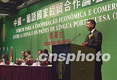 中國-葡語國家經(jīng)貿(mào)合作論壇(澳門)十二日在澳門舉行,澳門特區(qū)行政長官何厚鏵在開幕式上致辭。中新社記者:李剛