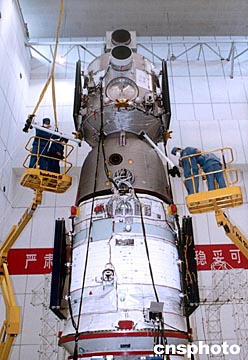 神舟五號載人飛船十月十五日上午九時在酒泉衛(wèi)星發(fā)射中心載人航天發(fā)射場發(fā)射升空。圖為神舟五號載人飛船組裝調(diào)試階段的資料圖。中新社圖