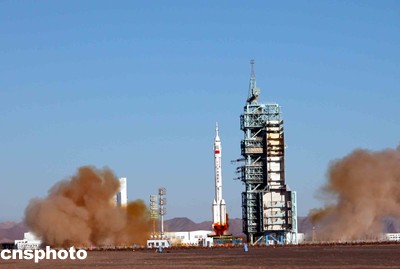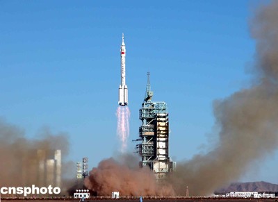 中國(guó)首位航天員楊利偉乘坐的“神舟”五號(hào)載人飛船,十五日上午九時(shí)整在酒泉衛(wèi)星發(fā)射中心載人航天發(fā)射場(chǎng)成功發(fā)射升空。中新社記者 孫自法 攝