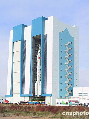 被稱為“亞洲第一門”的酒泉衛(wèi)星發(fā)射中心載人航天發(fā)射場總裝測試廠房大門開啟后,“神舟”五號載人飛船船箭塔組合體開始向發(fā)射塔架垂直轉(zhuǎn)運。中新社記者孫自法攝