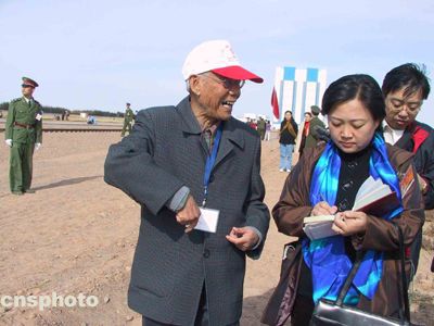 八十八歲高齡的中國老一輩航天人任新民老先生在“神舟”五號(hào)載人飛船垂直轉(zhuǎn)運(yùn)現(xiàn)場興致勃勃地接受記者采訪。中新社記者孫自法攝