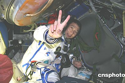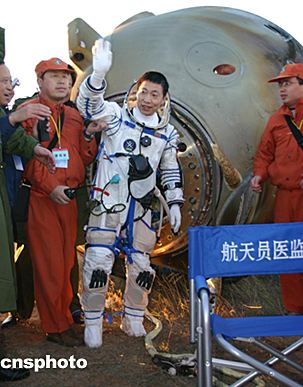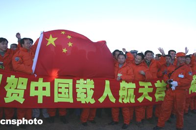 六時(shí)四十五分,身著白色宇航服的航天員從返回艙中神采奕奕探頭出來,他把面罩向上一拉,微笑著向迎接他回家的人們揮手致意。一時(shí)間、草原上掌聲雷動(dòng),許多人激動(dòng)地流下了熱淚。