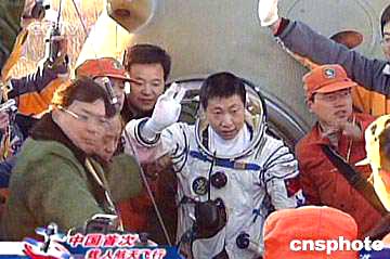 圖:中國(guó)首位航天員楊利偉自主走出返回艙