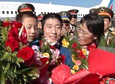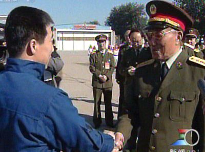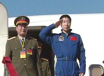 中新社北京十月十六日電 十六日上午,剛剛隨“神舟”五號(hào)飛船安全返回地面的中國(guó)首位航天員楊利偉,乘專(zhuān)機(jī)從內(nèi)蒙古著陸場(chǎng)飛抵北京。中共中央政治局委員、中央軍委副主席、國(guó)務(wù)委員兼國(guó)防部長(zhǎng)曹剛川在中央軍委委員、總裝備部部長(zhǎng)、載人航天工程總指揮李繼耐和總裝備部政委遲萬(wàn)春的陪同下到機(jī)場(chǎng)迎接。