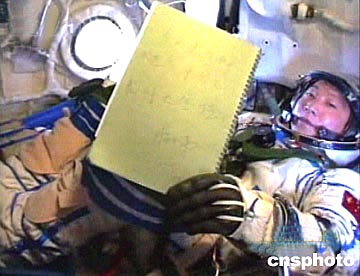 中國首位航天員楊利偉乘坐“神舟”五號飛船在太空飛行時展示航空日記。中新社 圖