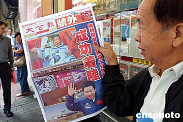 中新社香港十月十六日電中國首次載人航天的“神舟”五號今晨成功著陸后,香港《文匯報》、《大公報》以第一時間印出號外,市民紛紛搶閱。今天出版的香港主要報章,除圖文并茂地大幅報道“神舟”五號的相關(guān)消息外,還分別發(fā)表社評,祝賀這一壯舉。
