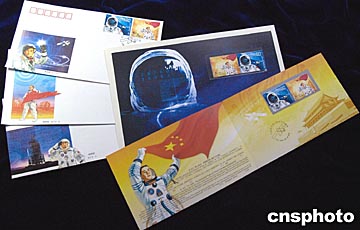 10月16日,北京市郵票公司配合國(guó)家郵政局發(fā)行《中國(guó)首次載人航天飛行成功》郵票1套2枚,特設(shè)計(jì)印制了《中國(guó)首次載人航天飛行成功》首日封(1套3枚、左)、郵折(右)、郵票大卡(中)等郵品,與郵票同時(shí)發(fā)行。中新社記者:鄒憲