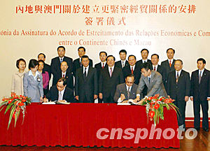 “內(nèi)地與澳門關(guān)于建立更緊密經(jīng)貿(mào)關(guān)系的安排”十七日下午在澳門特區(qū)政府總部舉行簽署儀式,國家商務(wù)部副部長安民和澳門經(jīng)濟財政司司長譚伯源,分別代表中央政府和澳門特區(qū)政府在協(xié)議上簽字,國家副主席曾慶紅專程來澳出席了簽署儀式。
