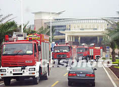 海南十月十七日舉行博鰲亞洲論壇安保演練,迎接十一月初召開的論壇年會(huì)。圖為消防車在會(huì)議接待酒店博鰲索菲特酒店前進(jìn)行消防演練。作者:王辛莉