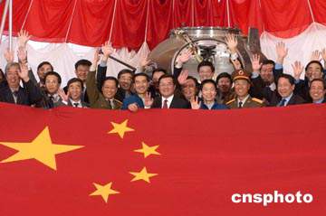 十月十八日,中國神舟五號載人飛船回收艙搭載物品開艙儀式在中國航天科技集團(tuán)公司北京空間技術(shù)研制試驗(yàn)中心舉行。隨載人飛船在太空翱翔二十多小時(shí)的巨幅五星紅旗從神舟五號載人飛船回收艙中被取出。中新社記者:張煒