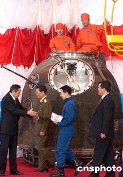 十月十八日,中國神舟五號載人飛船回收艙搭載物品開艙儀式在中國航天科技集團公司北京空間技術(shù)研制試驗中心舉行。中國首位航天員楊利偉向相關部門代表轉(zhuǎn)交從太空歸來的“貴賓”。搭載物品中包括來自臺灣地區(qū)的作物種子。中新社記者:張煒