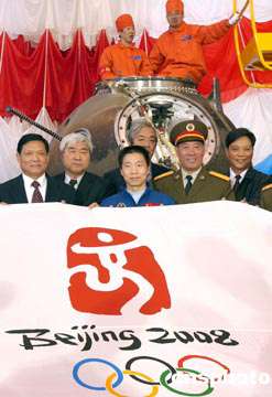 中午十二時(shí),當(dāng)北京奧組委主席劉淇從中國航天科技集團(tuán)公司總經(jīng)理張慶偉手中接過這面不尋常的旗幟時(shí),全場報(bào)以熱烈掌聲。今年八月底,中國航天科技集團(tuán)公司向北京奧組委發(fā)函,商請?jiān)凇吧裰邸蔽逄柹洗钶d二00八年奧運(yùn)會會徽旗幟。這個建議得到了積極而迅速的響應(yīng)。九月中旬,一面精心制作的印有“中國印·舞動的北京”圖案的大幅白色會旗正式交付中國航天科技集團(tuán)公司。十月十五日九時(shí),這面旗幟搭乘“神舟”五號踏上了遨游太空的旅程,并于十六日六時(shí)二十三分安全返回地面。