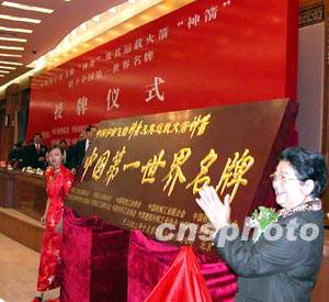 中國工業(yè)經(jīng)濟(jì)聯(lián)合會(huì)等十個(gè)工業(yè)行業(yè)協(xié)會(huì)和聯(lián)合會(huì)十八日在北京人民大會(huì)堂舉行儀式,為“神舟”、“神箭”的中國第一世界名牌授牌。