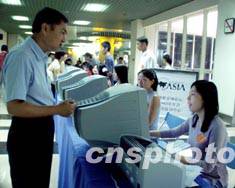 在?诿捞m機(jī)場(chǎng)國(guó)際到大廳,記者一進(jìn)大門(mén)就看到近十臺(tái)電腦一字排開(kāi),在電腦前工作的一律是“漂亮美眉”。