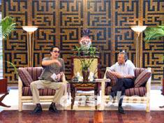 曾經(jīng)作為主招待酒店接待了兩屆博鰲亞洲論壇年會(huì)的博鰲金海岸溫泉大酒店,今年不再作為主會(huì)場(chǎng),但是中國(guó)國(guó)家領(lǐng)導(dǎo)人與各國(guó)政要的會(huì)見(jiàn)活動(dòng)依然在此舉行。今天下午,在位于博鰲水城的C島別墅,記者參與了會(huì)見(jiàn)演練:主會(huì)見(jiàn)廳是有南國(guó)風(fēng)情木百葉窗圍合的“鳥(niǎo)鳴軒”,酒店的工作人員與參加演練的“貴賓”在反復(fù)磨合接待程序,連如何推拉木門(mén)都有動(dòng)作標(biāo)準(zhǔn)。