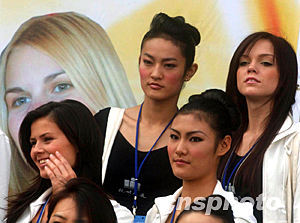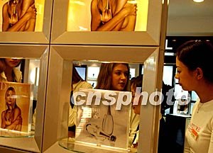 參加中國(guó)新絲路世界模特大賽的俄羅斯小姐,十月二十八日逛杭州大廈商場(chǎng),采購法國(guó)名牌香水。中新社記者:賈國(guó)榮