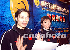 2003年中國(guó)杯世界花樣滑冰大獎(jiǎng)賽將于十一月初在北京舉行,來自十四個(gè)國(guó)家的六十四名優(yōu)秀運(yùn)動(dòng)員將參加這一重要國(guó)際賽事的角逐。圖為剛剛在美國(guó)站比賽中獲得雙人滑冠軍的中國(guó)選手龐清、佟健在二十九日舉行的新聞發(fā)布會(huì)上。中新社記者:武仲林