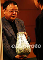 中國嘉德2003秋季拍賣會將于十一月舉行,十月三十日,眾多將拍賣的文物珍品開始在北京進行預展,著名影視演員王剛到現(xiàn)場探察拍賣品情況并對一款明清時代的青花瓷瓶仔細鑒賞。中新社記者:王麗南