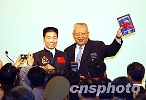 10月31日,身穿深藍色航天員制服的楊利偉在特首董建華陪同下進入禮賓府,特區(qū)政府和中聯(lián)辦官員、駐港部隊代表及各界知名人士在場歡迎。作者:洪少葵