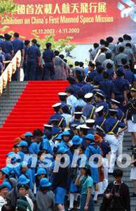 再往前,展出的就是展覽最神秘的部分──“神五”飛船返回艙、天空衣、天空食品和搭載的國旗等。在其后的正式開放參觀時(shí),這里擠滿了小朋友,好奇地問這問那,人人顯得很興奮,都說感到自豪。