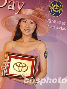 香港婦女銀袋賽十一月二日在沙田馬場(chǎng)舉行,獲得該賽頭馬的騎師親吻影星關(guān)之琳。中新社記者:潘索菲