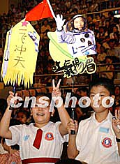 11月3日在香港伊利莎白體育館舉行的香港中、小學(xué)生與楊利偉及航天科學(xué)家見面會(huì)上,學(xué)生興高采烈舉著楊利偉像歡呼。中新社記者:錢興強(qiáng)