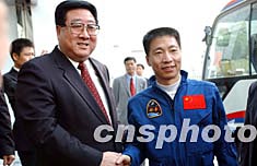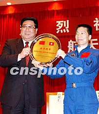 中國首飛航天員楊利偉,11月3日在中央政府駐香港聯(lián)絡(luò)辦受到熱烈歡迎,并接受中聯(lián)辦主任高祀仁贈送的“熱烈慶祝我國首次載人航天飛行圓滿成功”的銀碟。中新社記者:洪少葵