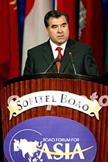 塔吉克斯坦共和國總統(tǒng)拉赫莫諾夫十一月三日在博鰲亞洲論壇2003年會上發(fā)表演講。中新社記者:毛建軍