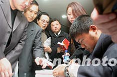 十一月五日,毛澤東之孫毛新宇在北京王府井書店為購買《爺爺毛澤東》一書的讀者簽名。毛新宇以一個(gè)親人的獨(dú)特視角抒寫了對爺爺?shù)恼鎿辞楦校磉_(dá)了對毛澤東的懷念。中新社記者:史利