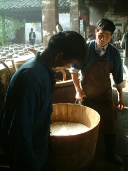 烏鎮(zhèn)的槽坊工人正在用傳統(tǒng)的工藝釀造美酒。