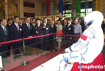 澳門(mén)特區(qū)行政長(zhǎng)官何厚鏵、全國(guó)政協(xié)副主席馬萬(wàn)祺、中央駐澳聯(lián)絡(luò)辦主任白志健等五日參觀澳門(mén)特區(qū)政府舉辦的「中國(guó)首次載人航天飛行展」時(shí)聽(tīng)取楊利偉的介紹。中新社記者:李剛