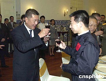 澳門(mén)特區(qū)政府五日在政府總部舉行歡迎晚宴,歡迎國(guó)家首飛航天員楊利偉和中國(guó)載人航天代表團(tuán)訪澳,圖為行政長(zhǎng)官何厚鏵在歡迎晚宴上向楊利偉祝酒。中新社記者:李剛