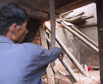 昨日上午,記者在爆炸現(xiàn)場看到,這個已是一片狼藉的地下鞭炮作坊原是一幢五開間的、土木結(jié)構(gòu)的廢舊民房,正廳的樓頂已被氣浪掀塌,幾根橫梁雜亂無章地堆在一起,正廳的三堵土墻已癱倒在地,其他房間的另幾堵墻也都有被震裂的縫隙,地面上隨處可見被炸開的鞭炮紙,一些村民正忙著從該房子里往外搬東西。