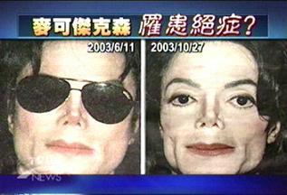 畫面左方是邁克爾-杰克遜今年6月的相片,看起來氣色還不錯。到了10月底,卻有驚人的落差,從右方相片可以看到,邁克爾兩頰凹陷、面如菜色,眼白混濁,連整形過后的鼻梁也快撐不住了。