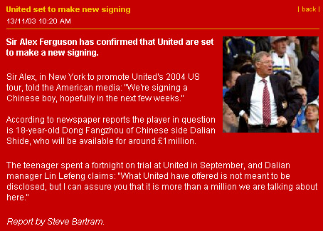 中新網(wǎng)11月14日電(記者 宋方燦)當(dāng)?shù)貢r間周三,曼聯(lián)俱樂部在其官方網(wǎng)站刊出最新消息,稱曼聯(lián)隊功勛教練弗格森已經(jīng)確認(rèn),曼聯(lián)將新簽入一名球員,而該球員就是中國小將董方卓。
